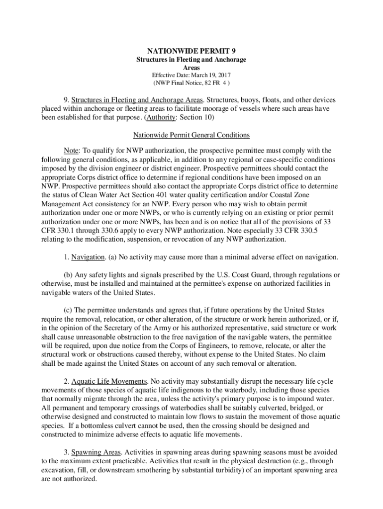 NATIONWIDE PERMIT 9 Structures in Fleeting and Anchorage Areas Effective Date: March 19, 2017 (NP Final Notice, 82 FR 4)9. Structures in Fleeting and Anchorage Areas. Structures, buoys, floats, and