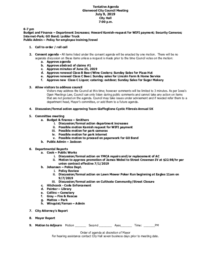 Tentative Agenda Glenwood City Council Meeting July 9, 2019, City Hall 7:00 p.m.67 pm Budget and Finance Department Increases; Howard Kamishrequest for Wi-Fi payment; Security Cameras; Internet Park;