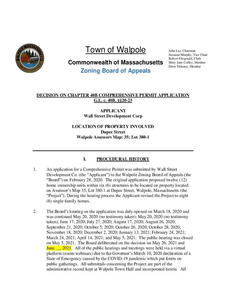 Town of Walpole Commonwealth of Massachusetts Zoning Board of Appeals John Lee, Chairman Susanne Murphy, Vice Chair Robert Fitzgerald, Clerk Mary Jane Coffey, Member Drew Delaney, MemberDECISION ON