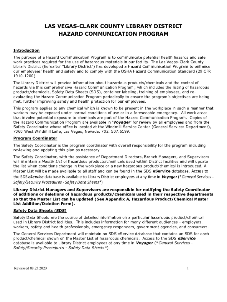 LAS VEGASCLARK COUNTY LIBRARY DISTRICT HAZARD COMMUNICATION PROGRAM Introduction The purpose of a Hazard Communication Program is to communicate potential health hazards and safe work practices required