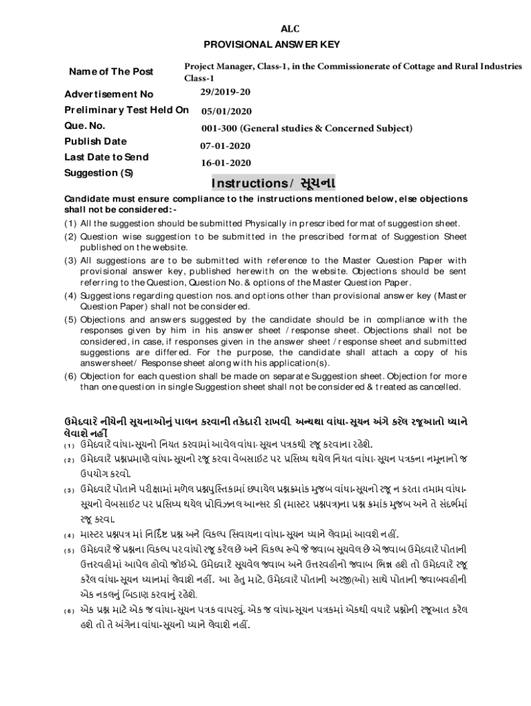 ALC PROVISIONAL ANSWER KEY Name of The PostProject Manager, Class1, in the Commissioner ate of Cottage and Rural Industries Class1Advertisement No29/201920Preliminary Test Held On05/01/2020Que. No.001300