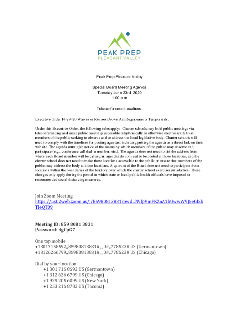 Peak Prep Pleasant ValleySpecial Board Meeting Agenda Tuesday, June 23rd, 2020 1:00 p.m Teleconference Locations: Executive Order N2920 Waives or Revises Brown Act Requirements Temporarily. Under