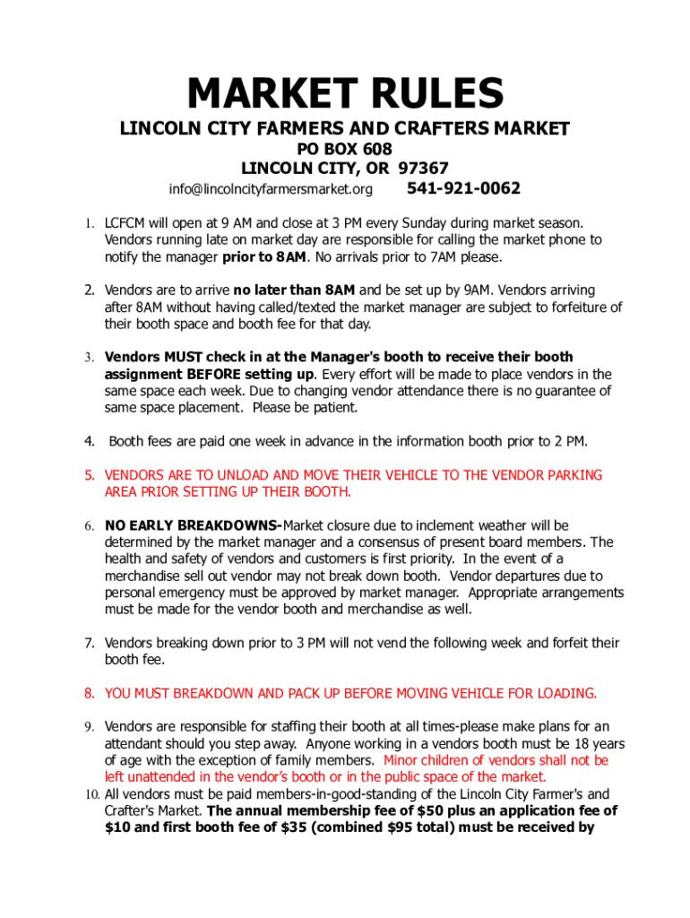 MARKET RULES LINCOLN CITY FARMERS AND CRATERS MARKET PO BOX 608 LINCOLN CITY, OR 97367 info@lincolncityfarmersmarket.org 54192100621. CFCM will open at 9 AM and close at 3 PM every Sunday during market