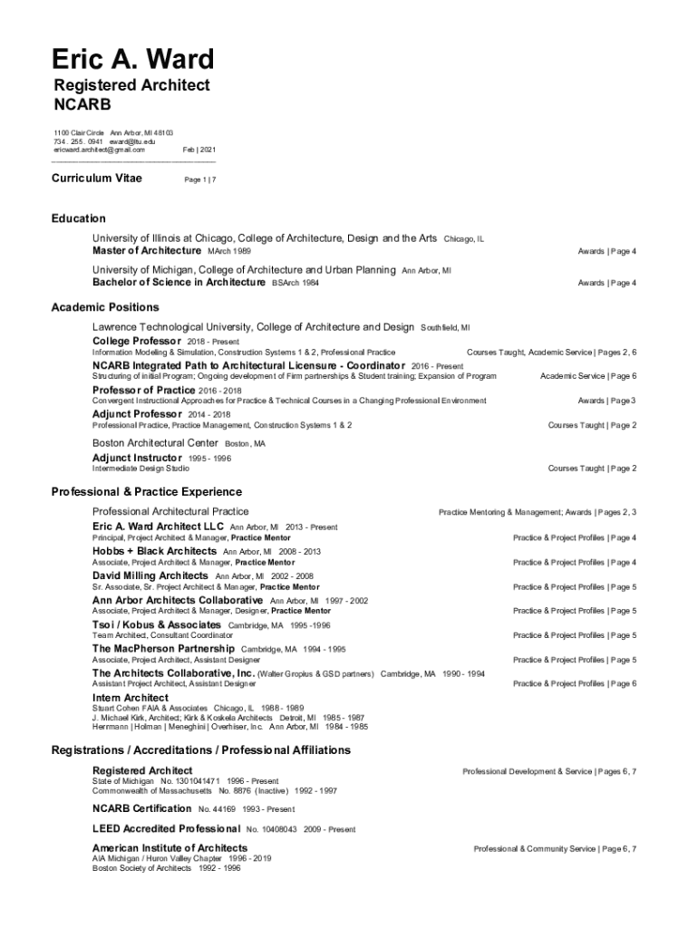 Eric A. Ward Registered Architect NC ARB 1100 Clair Circle Ann Arbor, MI 48103 734. 255. 0941 eward@ltu.edu ericward.architect@gmail.comFeb | 2021___Curriculum Vitae Page 1 | 7Education University