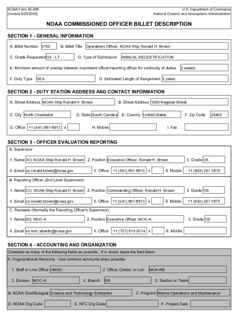 NOAA Form 5628A (revised 9/25/2009)U.S. Department of Commerce National Oceanic and Atmospheric Administration NOAA COMMISSIONED OFFICER BILLET DESCRIPTION SECTION 1 GENERAL INFORMATION A. Billet