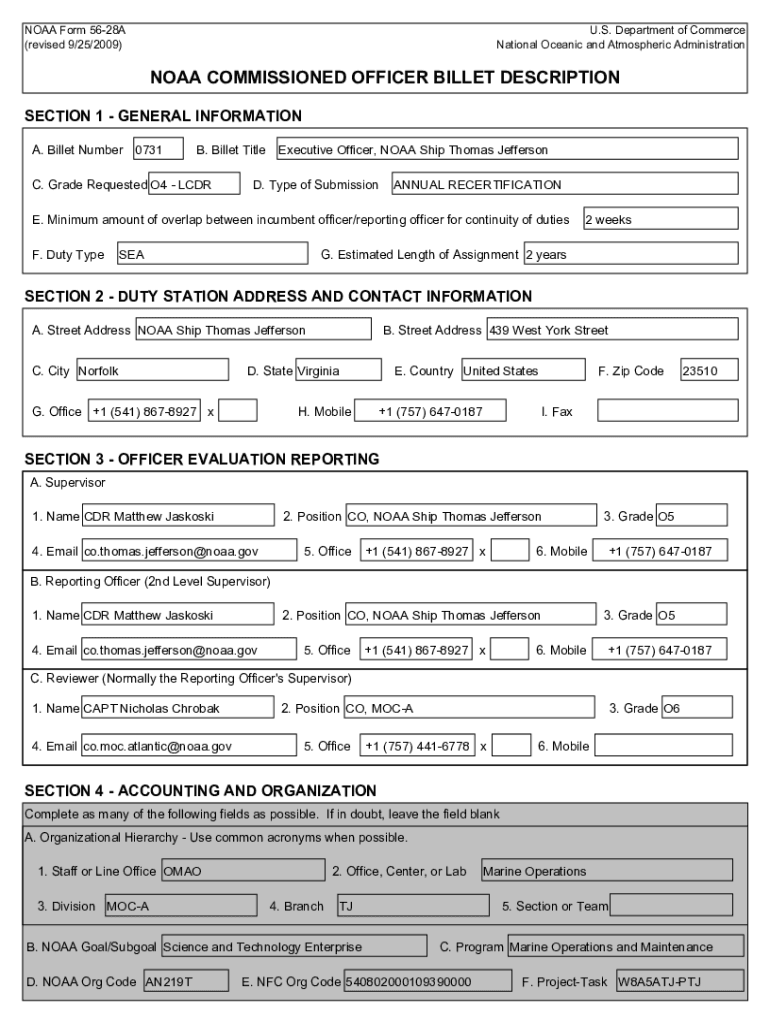 NOAA Form 5628A (revised 9/25/2009)U.S. Department of Commerce National Oceanic and Atmospheric Administration NOAA COMMISSIONED OFFICER BILLET DESCRIPTION SECTION 1 GENERAL INFORMATION A. Billet