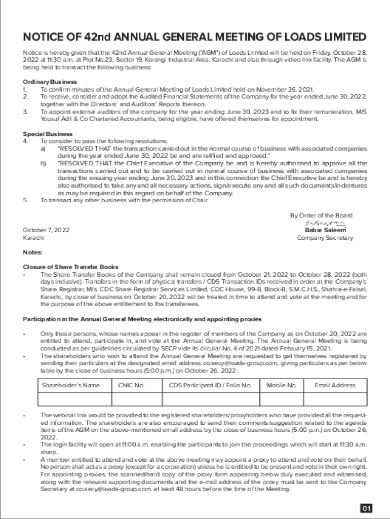 NOTICE OF 42nd ANNUAL GENERAL MEETING OF LOADS LIMITED Notice is hereby given that the 42nd Annual General Meeting (AGM) of Loads Limited will be held on Friday, October 28, 2022, at 11:30 a.m. at
