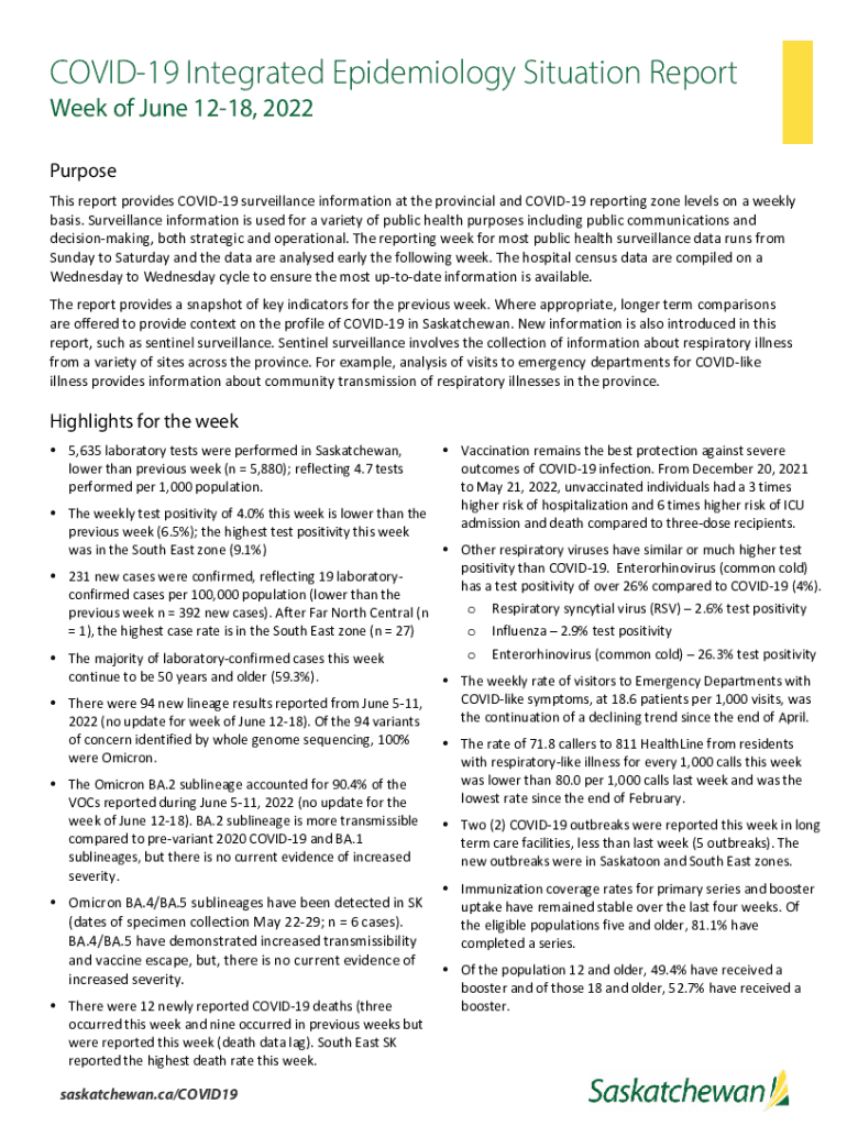 COVID-19 Integrated Epidemiology Situation Report Week of June 1218, 2022 Purpose This report provides COVID-19 surveillance information at the provincial and COVID-19 reporting zone levels on a weekly