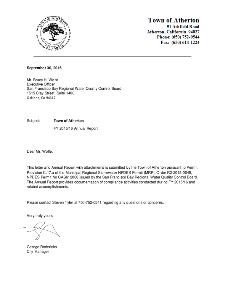 ___ September 30, 2016, Mr. Bruce H. Wolfe Executive Officer San Francisco Bay Regional Water Quality Control Board 1515 Clay Street, Suite 1400 Oakland, CA 94612Subject:Town of Atherton FY 2015/16
