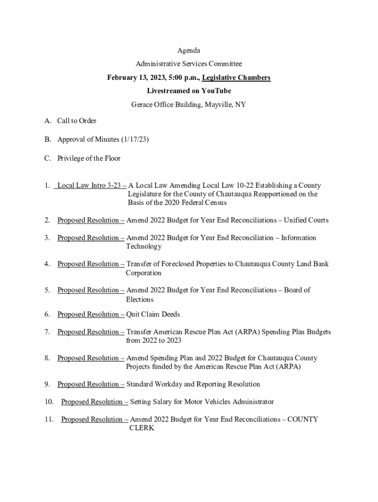 Agenda Administrative Services Committee February 13, 2023, 5:00 p.m., Legislative Chambers Livestreamed on YouTube Grace Office Building, Maryville, NY A. Call to Order B. Approval of Minutes (1/17/23)