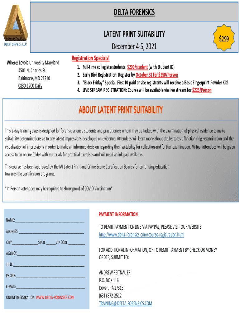 DELTA FORENSICS LATENT PRINT SUITABILITY December 45, 2021 Where: Loyola University Maryland 4501 N. Charles St. Baltimore, MD 21210 08301700 Daily$299Registration Specials! 1. 2. 3. 4. Full time