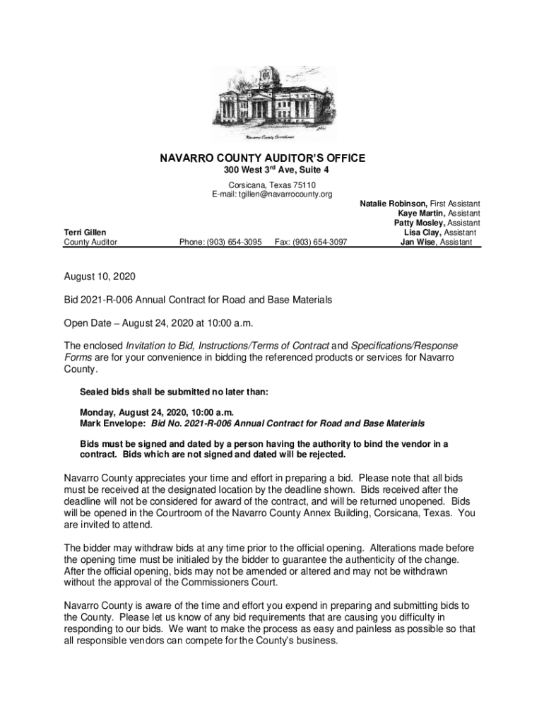 NAVARRO COUNTY AUDITORS OFFICE 300 West 3rd Ave, Suite 4 Corsican, Texas 75110 Email: tgillen@navarrocounty.orgTerri Gilles County AuditorPhone: (903) 6543095Fax: (903) 6543097Natalie Robinson, First