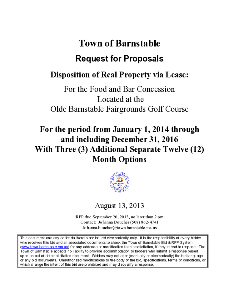 Town of Barnstable Request for Proposals Disposition of Real Property via Lease: For the Food and Bar Concession Located at the Old Barnstable Fairgrounds Golf Course For the period from January 1,