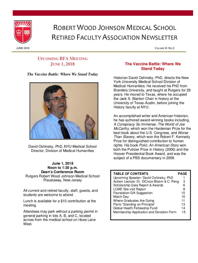 ROBERT WOOD JOHNSON MEDICAL SCHOOL RETIRED FACULTY ASSOCIATION NEWSLETTER JUNE 2018VOLUME XI. NO.2UPCOMING RFA MEETING JUNE 1, 2018, The Vaccine Battle: Where We Stand Today David Shiny, PhD, NYU