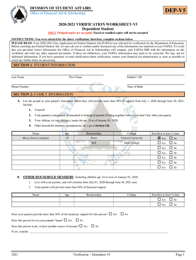 DIVISION OF STUDENT AFFAIRSDEPV5Office of Financial Aid & Scholarships20202021 VERIFICATION WORKSHEETV5 Dependent Student ONLY Original copies are accepted. Faxed or emailed copies will not be accepted