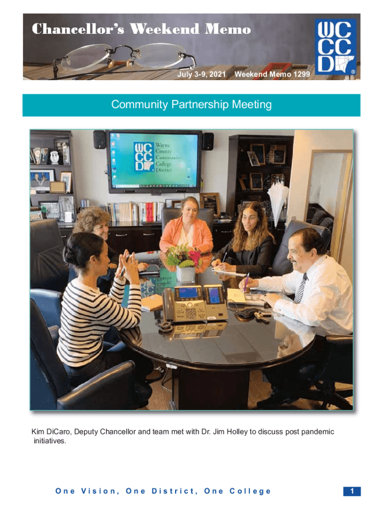 July 39, 2021Weekend Memo 1299Community Partnership Meeting Kim Diary, Deputy Chancellor and team met with Dr. Jim Holley to discuss post pandemic initiatives. One Vision, One District, One College1Some