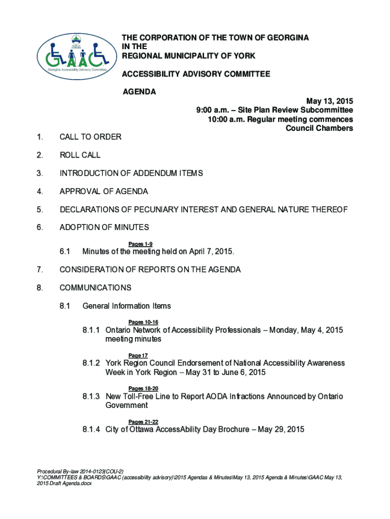 THE CORPORATION OF THE TOWN OF GEORGINA IN THE REGIONAL MUNICIPALITY OF YORK ACCESSIBILITY ADVISORY COMMITTEE AGENDA May 13, 2015 9:00 a.m. Site Plan Review Subcommittee 10:00 a.m. Regular meeting