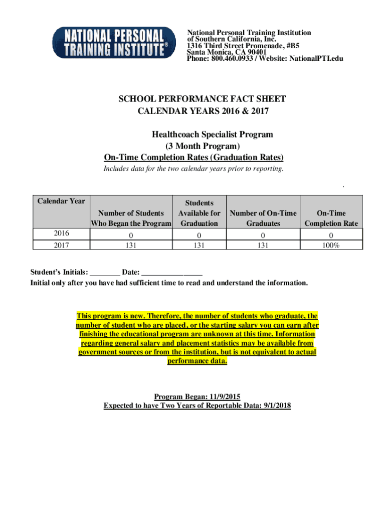 National Personal Training Institution of Southern California, Inc. 1316 Third Street Promenade, #B5 Santa Monica, CA 90401 Phone: 800.460.0933 / Website: National PTI.school PERFORMANCE FACT SHEET