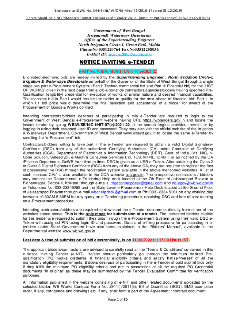 (Enclosure to IOWA No. 344(8)IB/IN/O/IBMisc72/201617dated 03.12.2019) (Latest Modified ENIT Standard Format for works of Tender Value (Amount Put to Tender) above Rs 45.0 lakh)Government of West Bengal