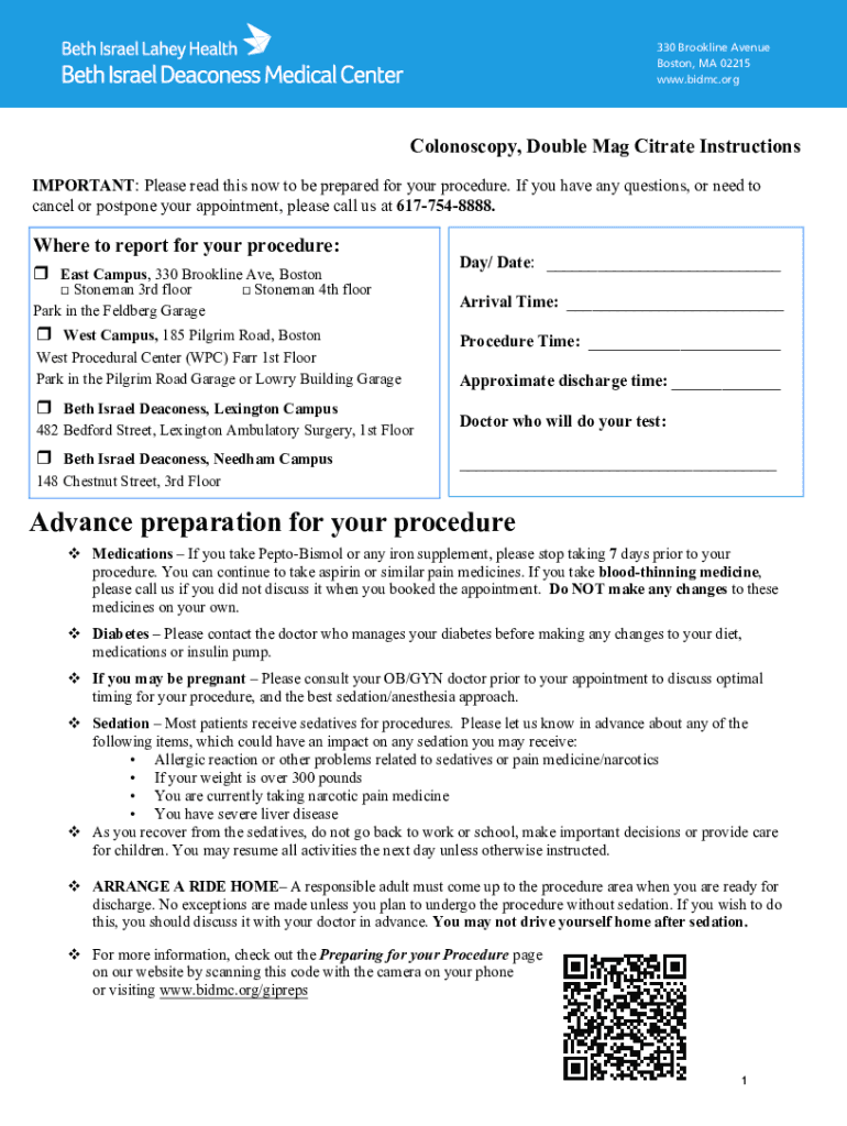 330 Brookline Avenue Boston, MA 02215 www.bidmc.orgColonoscopy, Double Mag Citrate Instructions IMPORTANT: Please read this now to be prepared for your procedure. If you have any questions, or need
