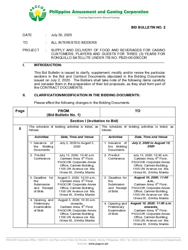 BID BULLETIN NO. 2 DATE:July 30, 2020TO:ALL INTERESTED BIDDERSPROJECT:SUPPLY AND DELIVERY OF FOOD AND BEVERAGES FOR CASINO CUSTOMERS, PLAYERS AND GUESTS FOR THREE (3) YEARS FOR TRANQUILLY SATELLITE