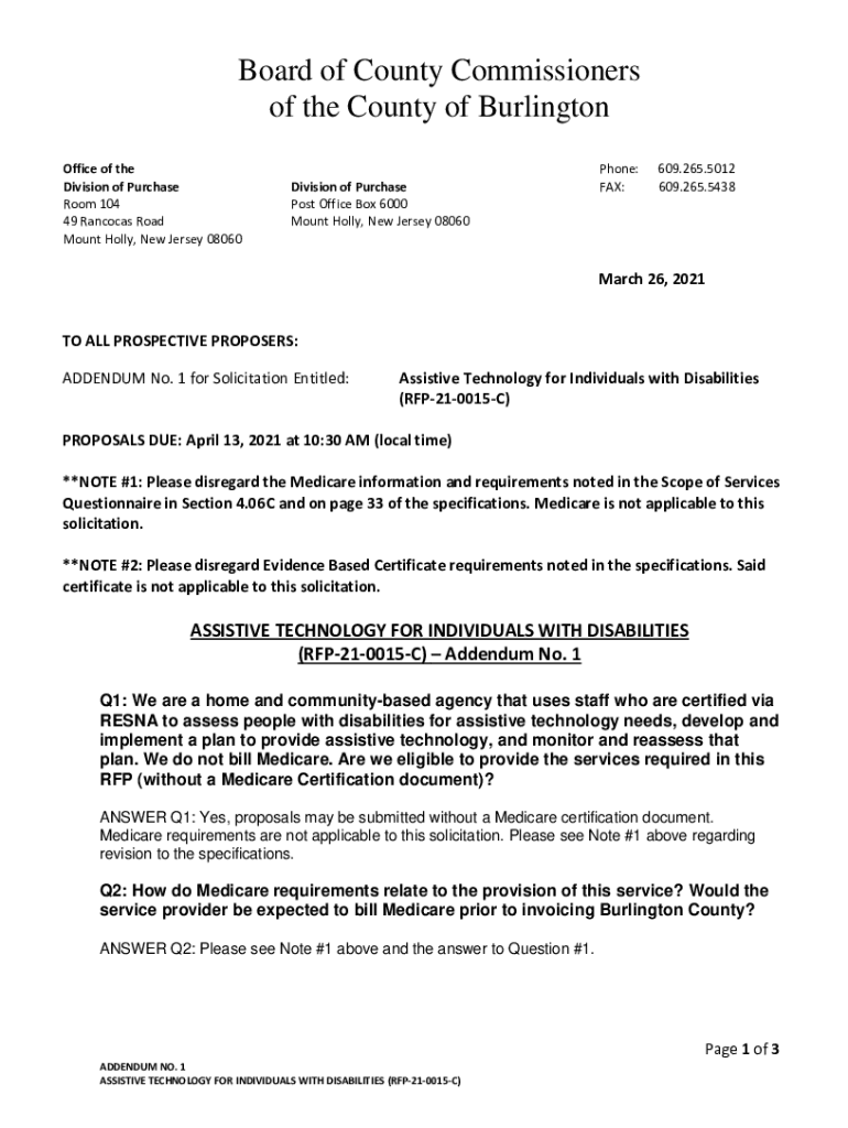 Board of County Commissioners of the County of Burlington Office of the Division of Purchase Room 104 49 Reynolds Road Mount Holly, New Jersey 08060Division of Purchase Post Office Box 6000 Mount