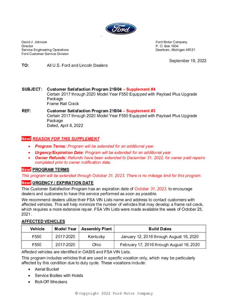 `David J. Johnson Director Service Engineering Operations Ford Customer Service Division Ford Motor Company P. O. Box 1904 Dearborn, Michigan 48121September 19, 2022TO:All U.S. Ford and Lincoln DealersSUBJECT:Customer