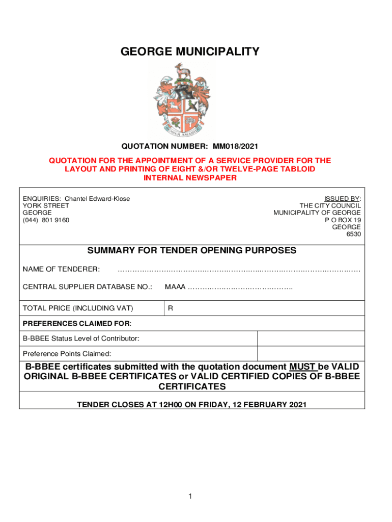 GEORGE MUNICIPALITYQUOTATION NUMBER: MM018/2021 QUOTATION FOR THE APPOINTMENT OF A SERVICE PROVIDER FOR THE LAYOUT AND PRINTING OF EIGHT &/OR TWELVEPAGE TABLOID INTERNAL NEWSPAPER Inquiries: Channel