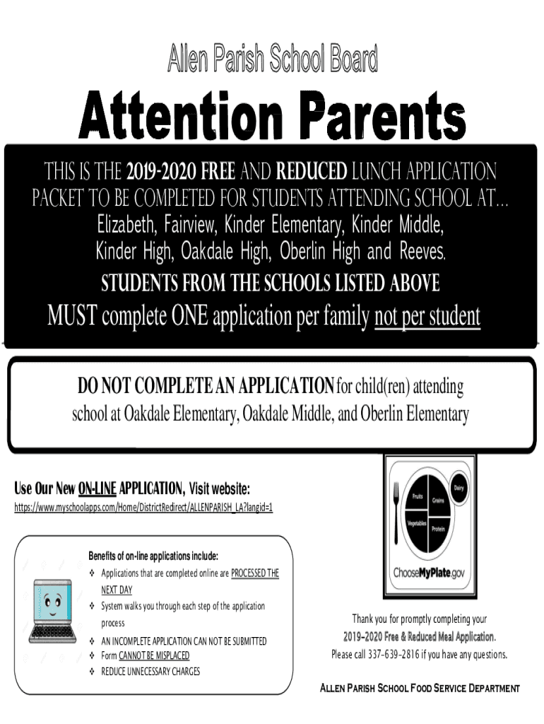 This is the 20192020 Free and Reduced lunch application packet to be completed for students attending school at Elizabeth, Fairview, Kinder Elementary, Kinder Middle, Kinder High, Oakdale High, Oberlin