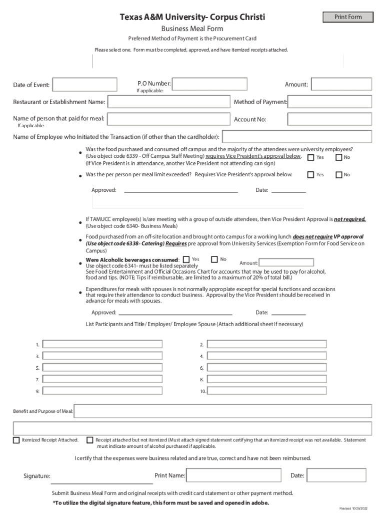 Texas A&M University Corpus ChristiPrint Agribusiness Meal Form Preferred Method of Payment is the Procurement Card Please select one. Form must be completed, approved, and have itemized receipts