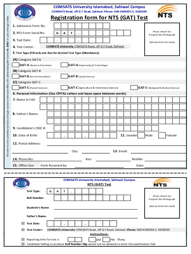 COMBATS University Islamabad, Sahiwal Campus This form must be submitted by hand or though courier to Admission Office IIT, Sahiwal along with Test fee Rs. 1000/ in cash or though challanCOMSATS Road,