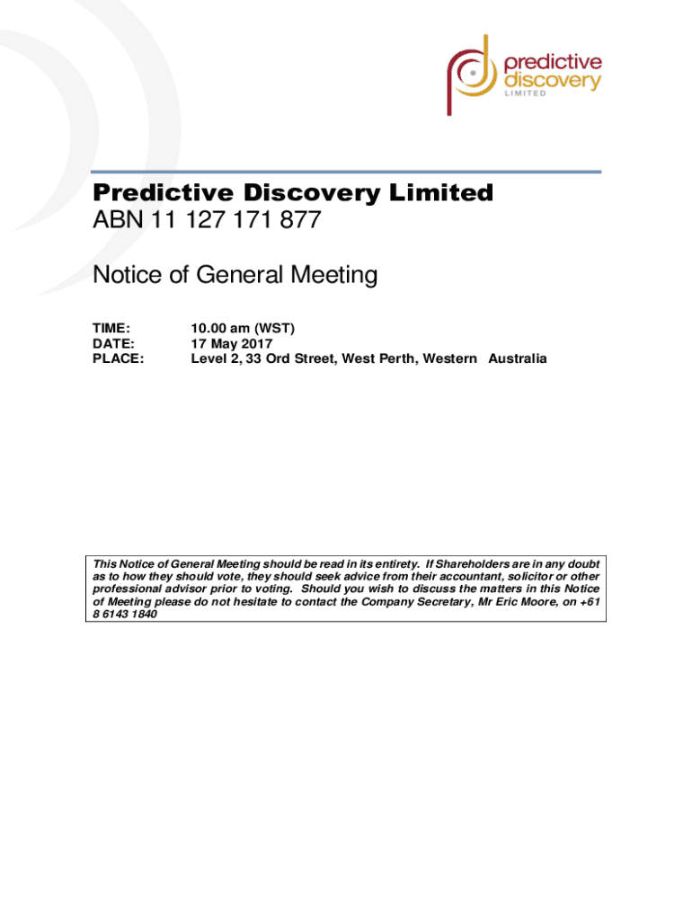Predictive Discovery Limited ABN 11 127 171 877 Notice of General Meeting TIME: DATE: PLACE:10.00 am (WST) 17 May 2017 Level 2, 33 ORD Street, West Perth, Western Australians Notice of General Meeting