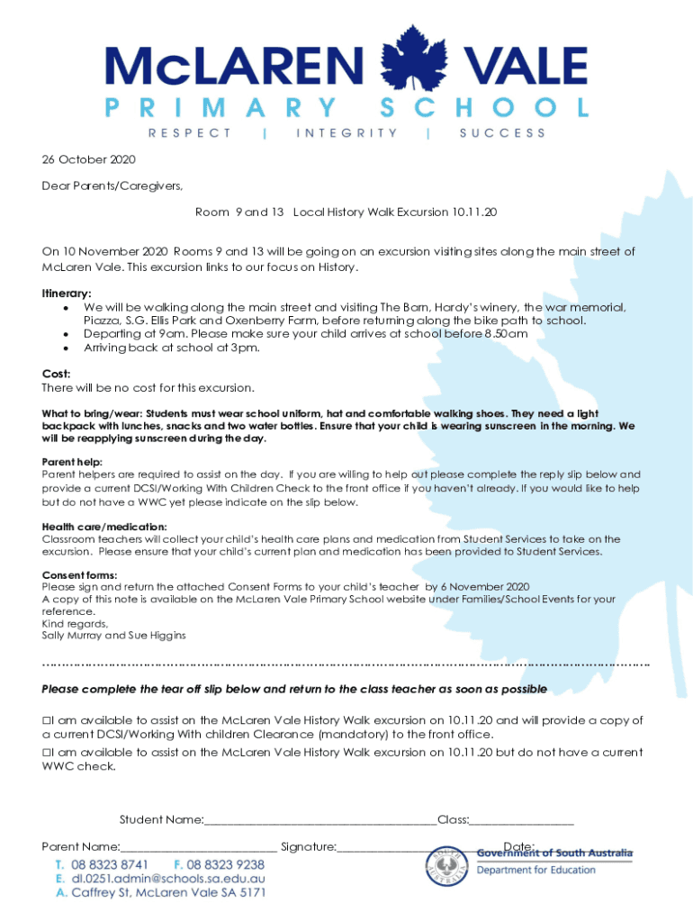 26 October 2020 Dear Parents/Caregivers, Room 9 and 13 Local History Walks Excursion 10.11.20 On 10 November 2020 Rooms 9 and 13 will be going on an excursion visiting sites along the main street