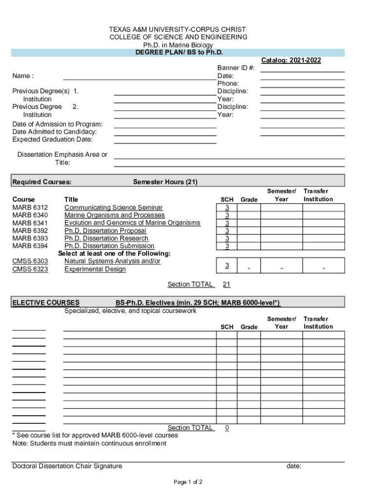 TEXAS A&M UNIVERSITYCORPUS CHRISTI COLLEGE OF SCIENCE AND ENGINEERING Ph.D. in Marine Biology DEGREE PLAN/ BS to Ph.D. Catalog: 20212022 Banner ID #: Date: Phone: Discipline: Year: Discipline: Year:Name