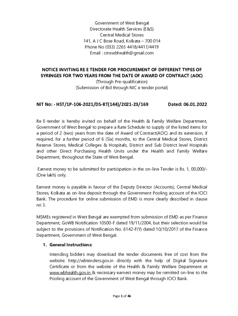 Government of West Bengal Directorate Health Services (E&S) Central Medical Stores 141, A J C Bose Road, Kolkata 700 014 Phone No (033) 2265 4418/4417/4419 Email : cmswbhealth@gmail.com NOTICE INVITING
