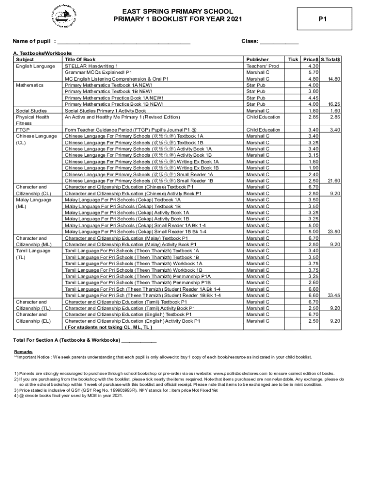 EAST SPRING PRIMARY SCHOOL PRIMARY 1 BOOKLET FOR YEAR 2021 Name of pupil : ___ A. Textbooks/Workbooks Subject Title Of Book English Language STELLAR Handwriting 1 Grammar MCQs Explained! P1 MC English