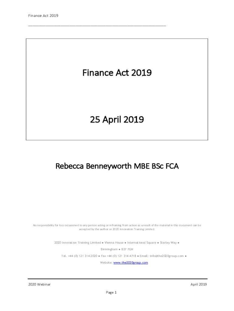 Finance Act 2019 ___Finance Act 201925 April 2019Rebecca Pennyworth BE B.Sc. FCA No responsibility for loss occasioned to any person acting or refraining from action as a result of the material in