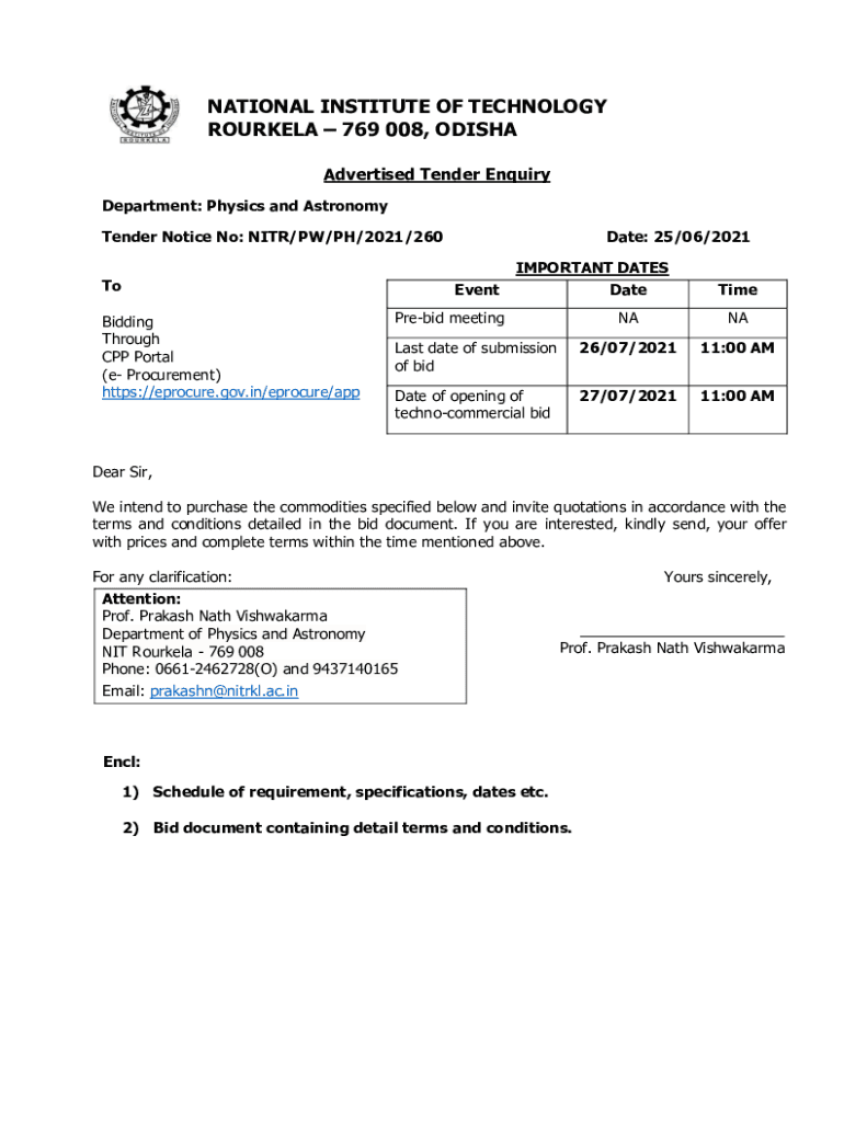NATIONAL INSTITUTE OF TECHNOLOGY ROURKELA 769 008, ODISHA Advertised Tender Inquiry Department: Physics and Astronomy Tender Notice No: NIR/PW/PH/2021/260 Date: 25/06/2021 Overbidding Through CPP