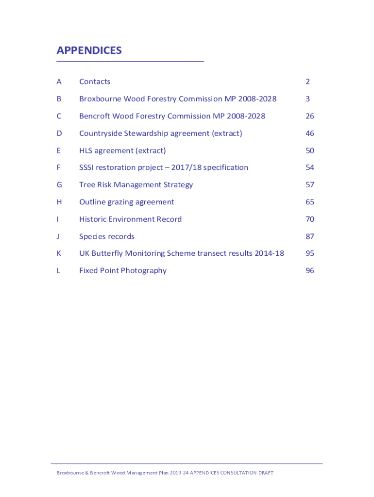 APPENDICES AContacts2BBroxbourne Wood Forestry Commission MP 200820283CBencroft Wood Forestry Commission MP 2008202826DCountryside Stewardship agreement (extract)46EHLS agreement (extract)50FSSSI