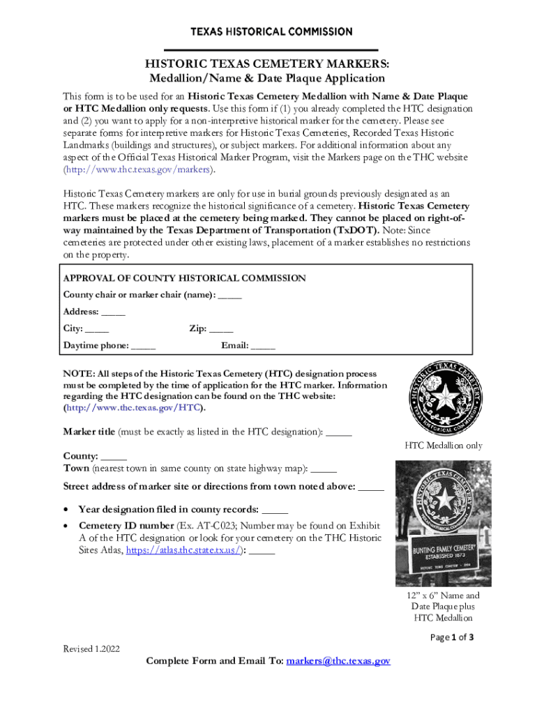 HISTORIC TEXAS CEMETERY MARKERS: Medallion/Name & Date Plaque Application This form is to be used for an Historic Texas Cemetery Medallion with Name & Date Plaque or HTC Medallion only requests. Use