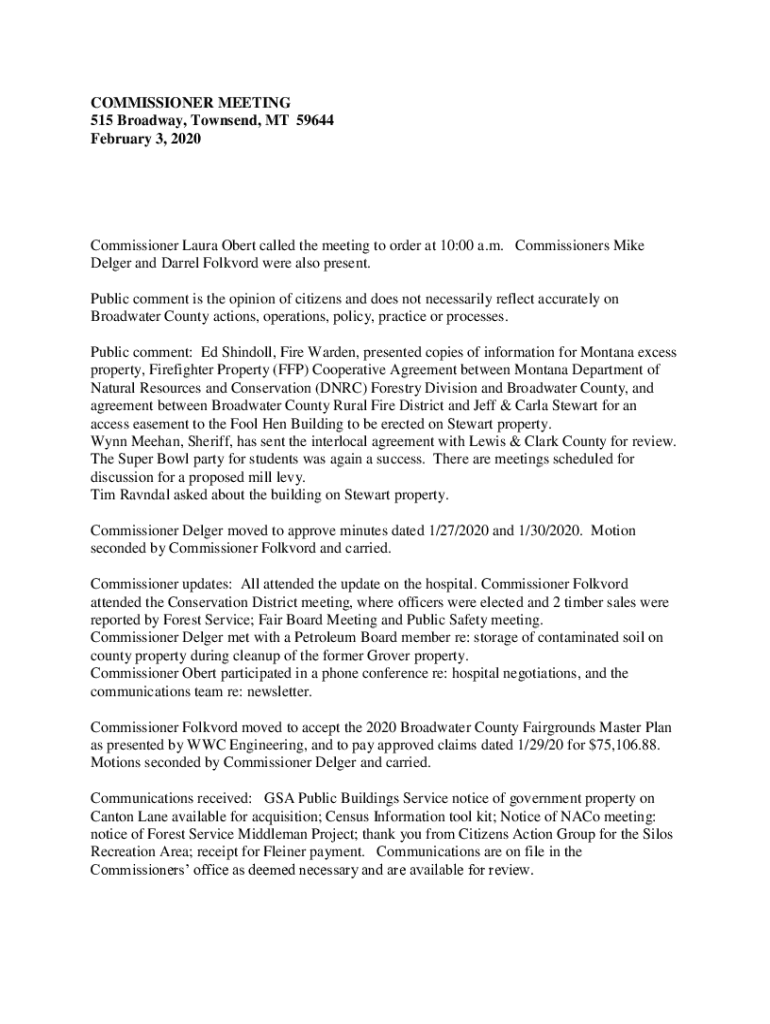 COMMISSIONER MEETING 515 Broadway, Townsend, MT 59644 February 3, 2020Commissioner Laura Robert called the meeting to order at 10:00 a.m. Commissioners Mike Delver and Darrel Folklore were also present.