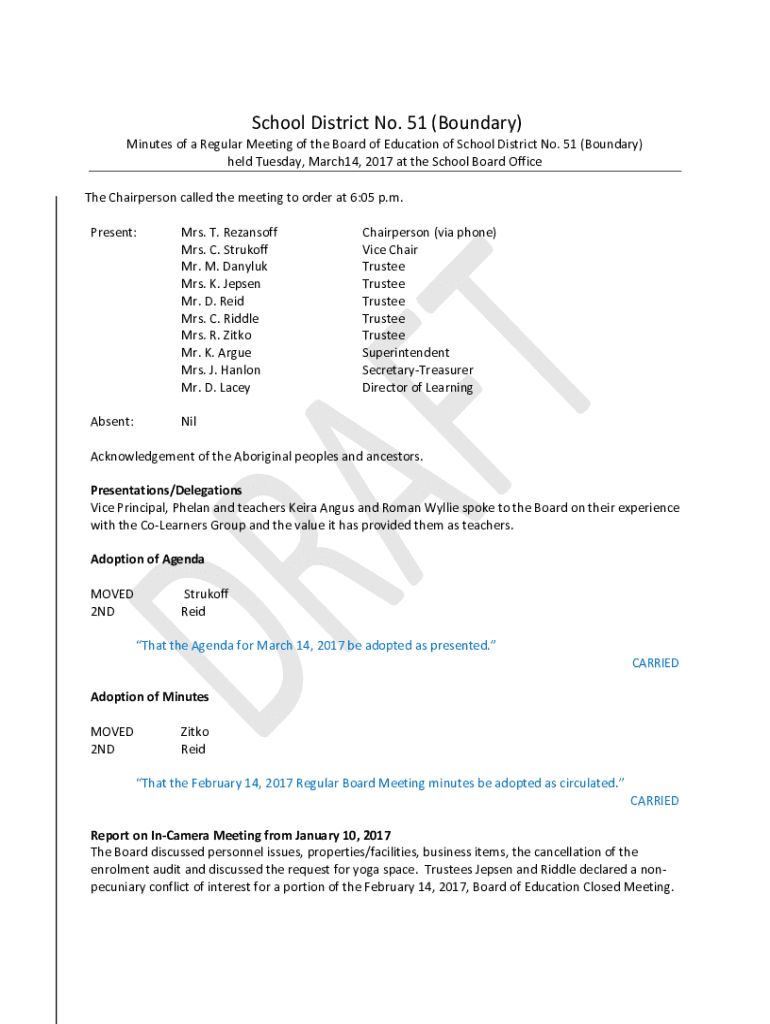 Minutes of a Regular Meeting of the Board of Education of School District No. 51 (Boundary)