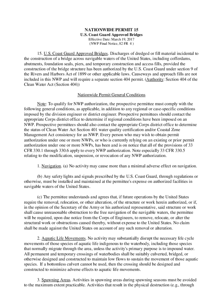 NATIONWIDE PERMIT 15 U.S. Coast Guard Approved Bridges Effective Date: March 19, 2017 (NP Final Notice, 82 FR 4)15. U.S. Coast Guard Approved Bridges. Discharges of dredged or fill material incidental