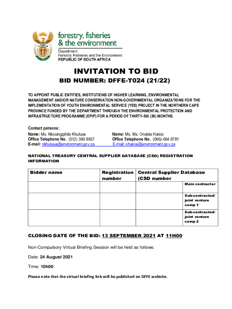 INVITATION TO BID NUMBER: DFFET024 (21/22) TO APPOINT PUBLIC ENTITIES, INSTITUTIONS OF HIGHER LEARNING, ENVIRONMENTAL MANAGEMENT AND/OR NATURE CONSERVATION NONGOVERNMENTAL ORGANIZATIONS FOR THE IMPLEMENTATION