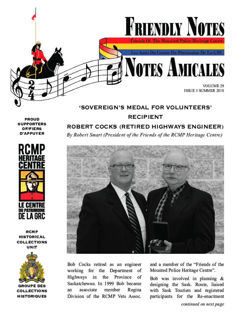 FRIENDLY NOTES AMICABLE Friends Of The Mounted Police Heritage Center Les AMIS Du Center Du Patrimony De La VOLUME 29 ISSUE 3 SUMMER 2018PROUD SUPPORTERS OF/FIBERS DAPPUYERSOVEREIGNS MEDAL FOR VOLUNTEERS