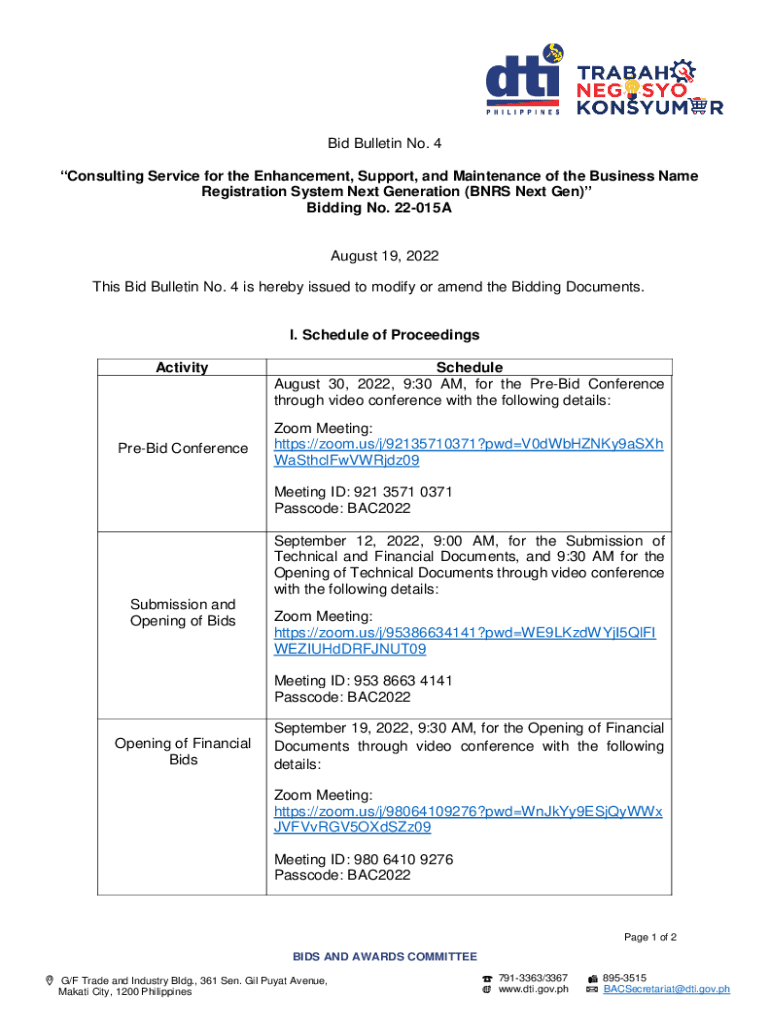 Bid Bulletin No. 4 Consulting Service for the Enhancement, Support, and Maintenance of the Business Name Registration System Next Generation (BARS Next Gen) Bidding No. 22015AAugust 19, 2022 This