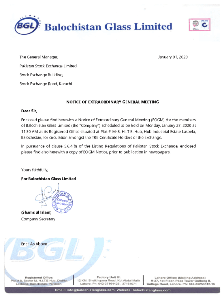 The General Manager, January 01, 2020Pakistan Stock Exchange Limited, Stock Exchange Building, Stock Exchange Road, KarachiNOTICE OF EXTRAORDINARY GENERAL MEETING Dear Sir, Enclosed please find herewith