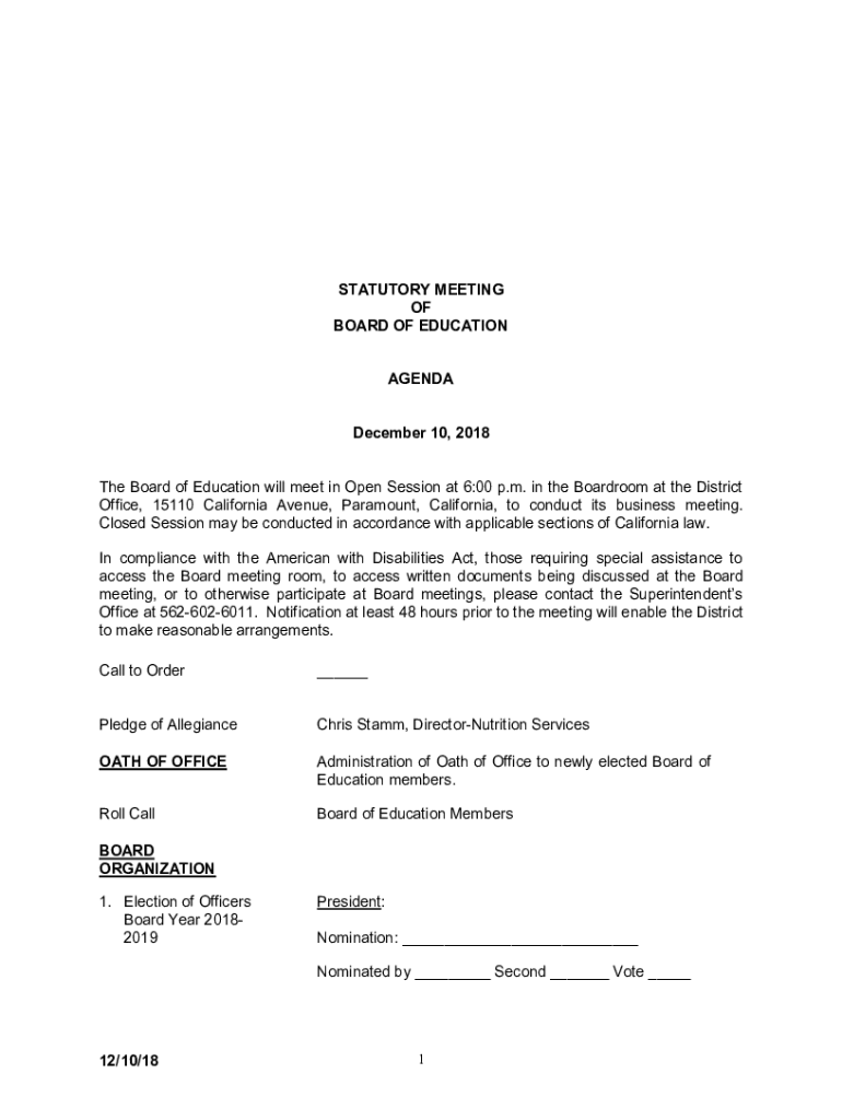 STATUTORY MEETING OF BOARD OF EDUCATION AGENDA December 10, 2018, The Board of Education will meet in Open Session at 6:00 p.m. in the Boardroom at the District Office, 15110 California Avenue, Paramount,