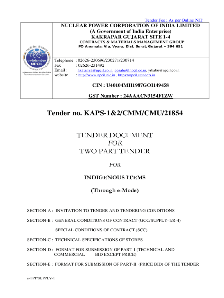 Tender Fee : As per Online NONNUCLEAR POWER CORPORATION OF INDIA LIMITED (A Government of India Enterprise) KANDAHAR GUJARAT SITE 14 CONTRACTS & MATERIALS MANAGEMENT GROUP PO Animal, Via. Vieira,
