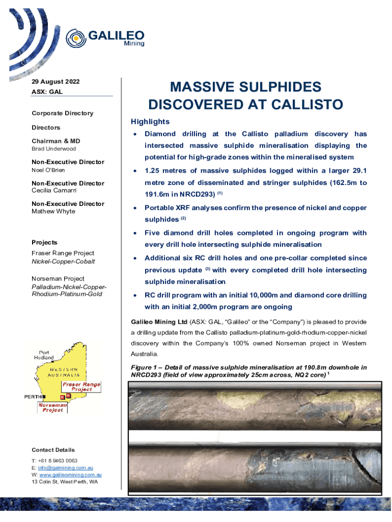29 August 2022MASSIVE SULPHIDES DISCOVERED AT CALLISTO: GAL Corporate Directory Directors Chairman & Highlights intersected massive sulphide mineralization displaying the Brad UnderwoodNonExecutive